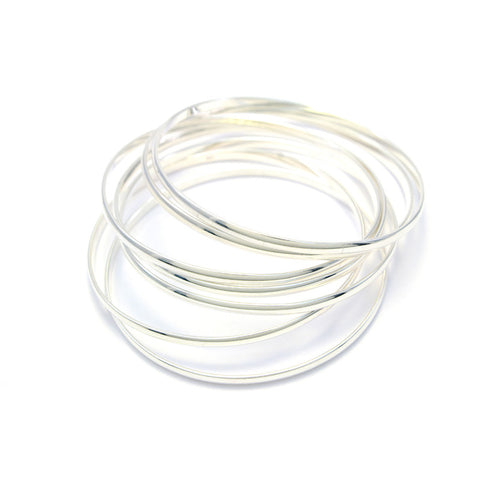These plain silver tone bracelets are perfect for everyday wear. Plain bangles are a staple of every girls' collection. These come in a pace of seven so add few to a bracelet stack or wear them all for a classic look. Flat on the inside of the band for comfort and curved on the outside for a warm organic feel. Silver plated over white bronze.